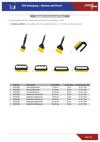 Die Bürsten und Pinsel sind mit gelben permanent dissipativen Borsten (ca. 10 - 10 Ω) aus Polyamid bestückt.